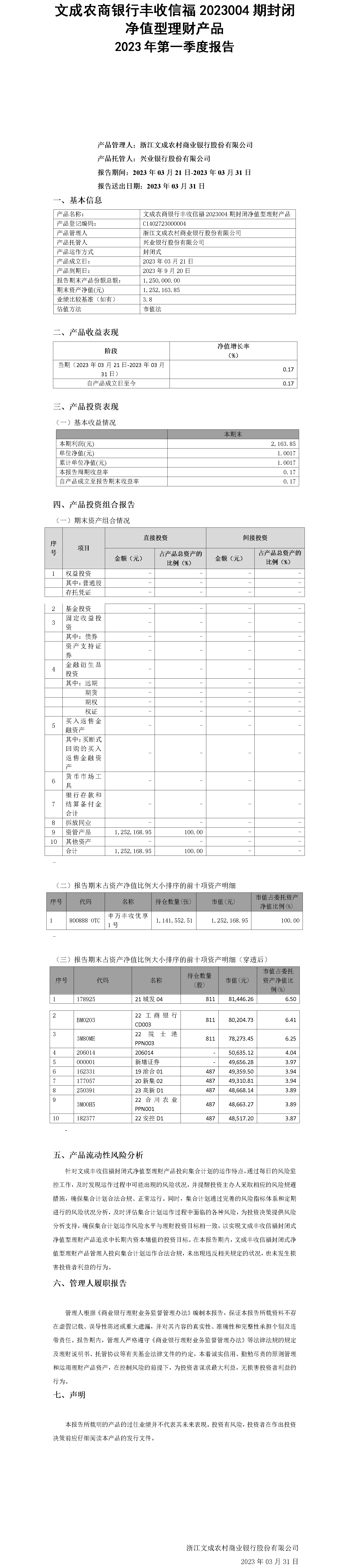 文成农商银行丰收信福2023004期封闭净值型理财产品2023年第一季度报告