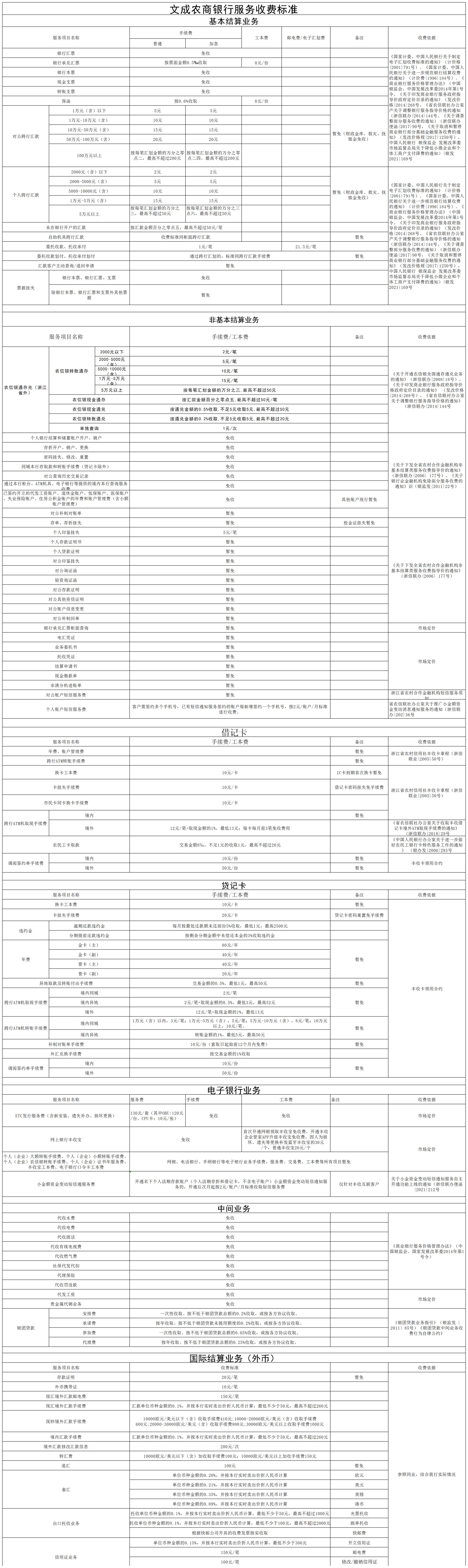 文成农商银行服务收费标准